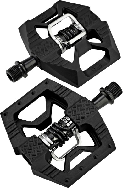 Crank Brothers Pedala Double Shot imajo profil z rebri in zatiči za boljši oprijem, širok Q-faktor za stabilnost pri višjih hitrostih ter vzdržljive vezi iz jekla.